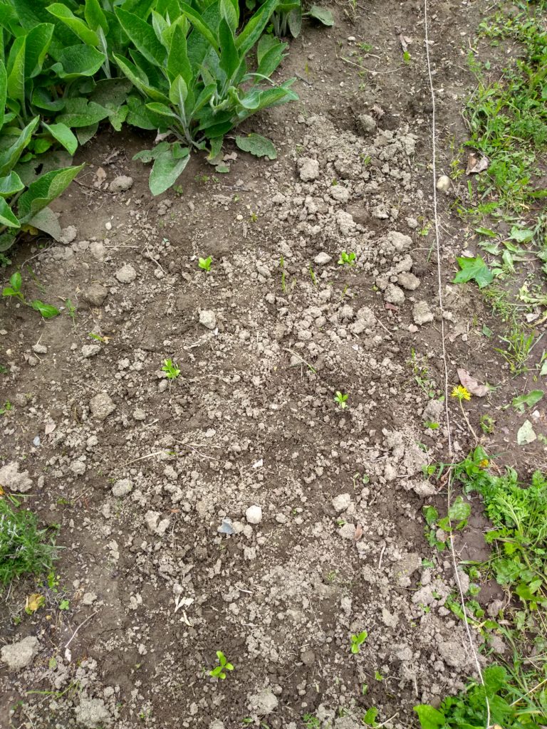 Putting the tiny plants in the garden. Give them enough room to grow.
