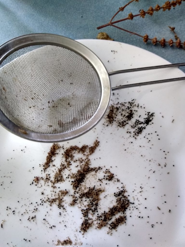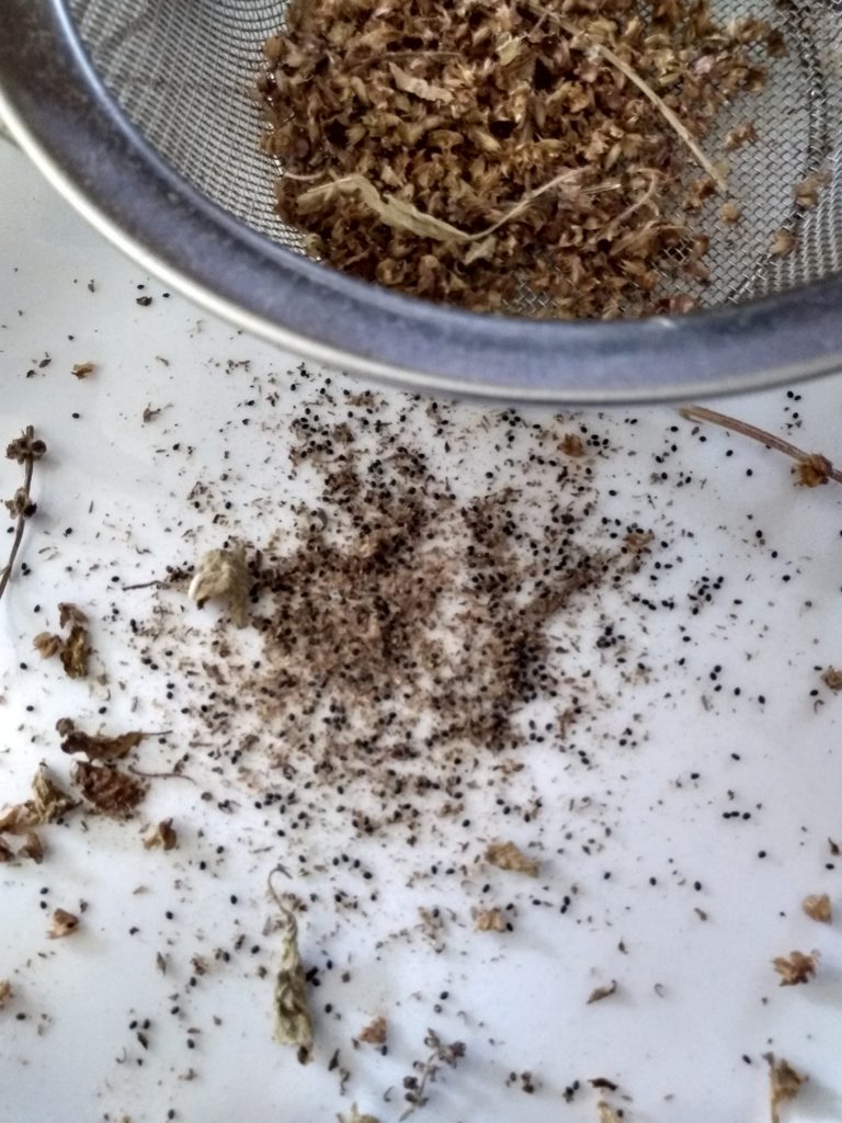 The seeds are black and tiny. Use a strainer that has small opening to seperate the plant material from the seeds.